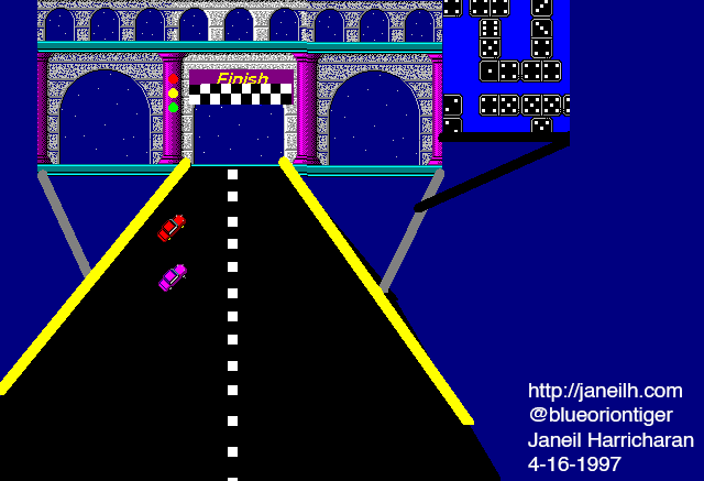 Apparently I made this masterpiece with clipart off of a Softdisk Publishing disk we’d received in the mail. I was heavily influenced by the Drivin’ USA game that was popular at the time, which had multiple arcade cabinets in almost every pizza place and Walmart I stepped foot in.