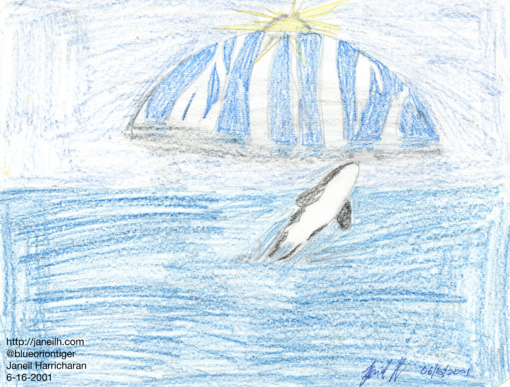 This was done in line with my previous piece of “whales in outer space”. Except this time, I went a more realistic route; if the orca was living on an alien planet, with another world hanging in the sky.